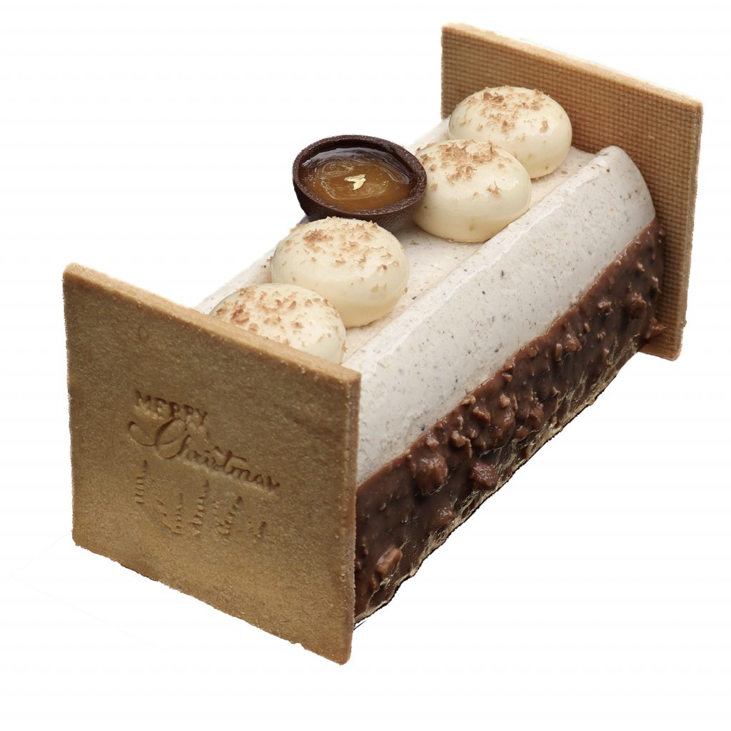 Soft vanilla sponge topped with passion fruit jelly, caramel crémeux, praline mousse, caramel chantilly, dipped in rocher glaze and decorated with vanilla sablé.